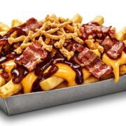 Frites, sauce cheddar, Bacon grillé, Sauce BBQ, Oignons frits
